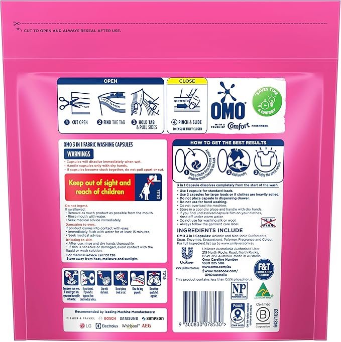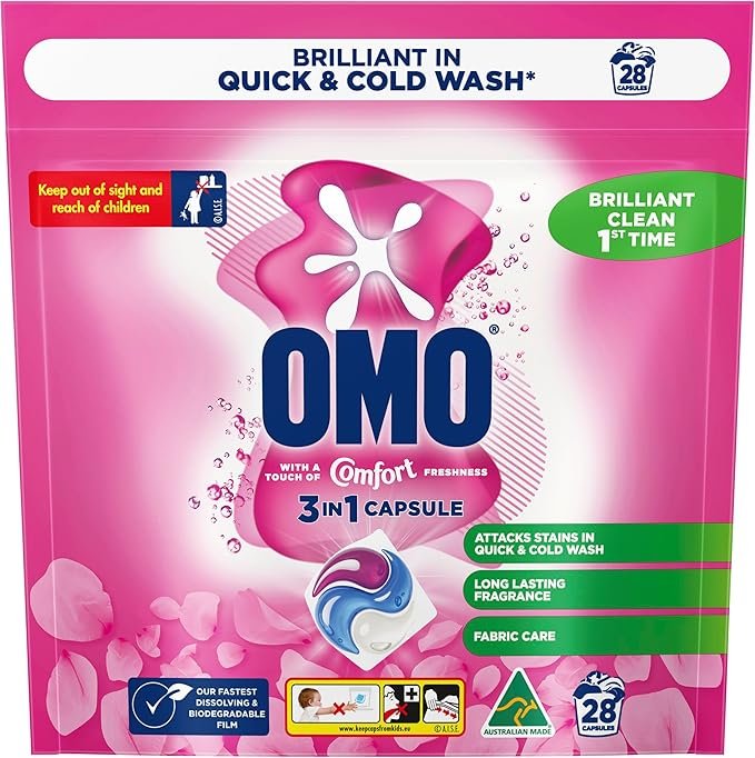 OMO Touch of Comfort 3-in-1 Capsules attack stains even in quick/cold washes, give a brilliant cleanTough on stains, our laundry capsules go beyond the surface to care for the fabric of your clothesThese laundry capsules leave your clothes smelling great with a touch of Comfort-inspired freshnessPop one capsule into the back of the washing machine drum, add laundry and enjoy great results